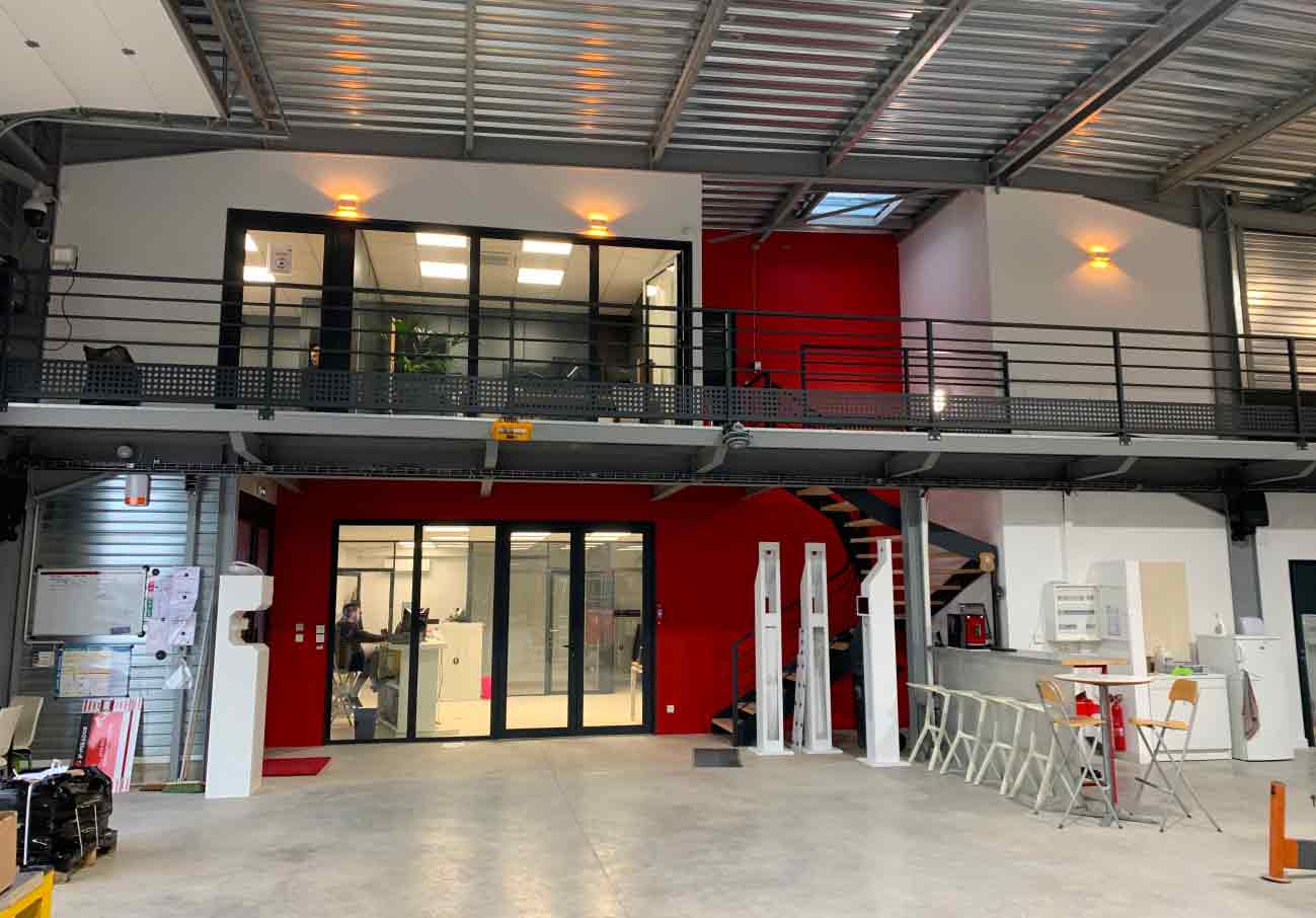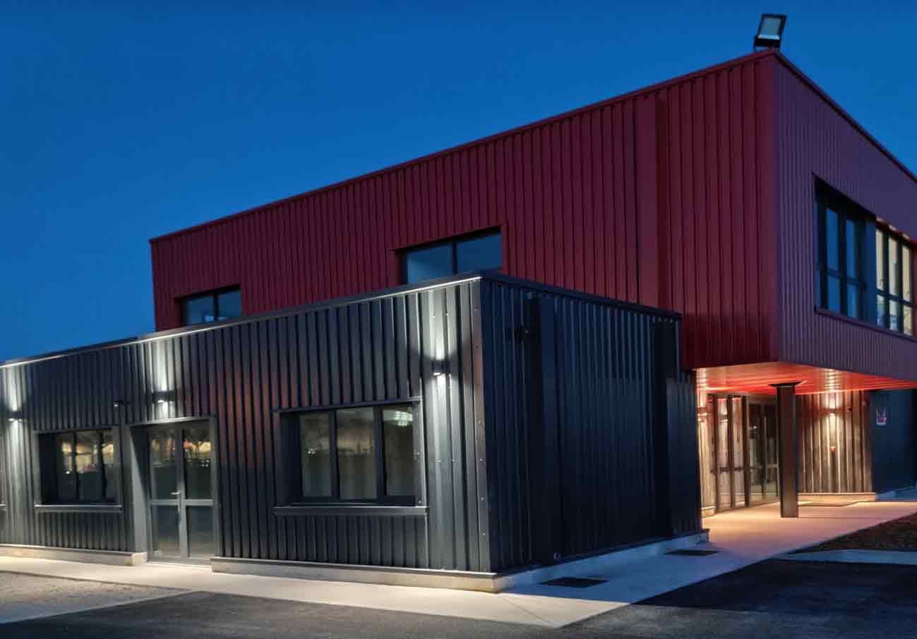 Architecture : le volume rouge des bureaux et de l’administration domine «comme une tour de contrôle» l’accès extérieur et l’atelier.